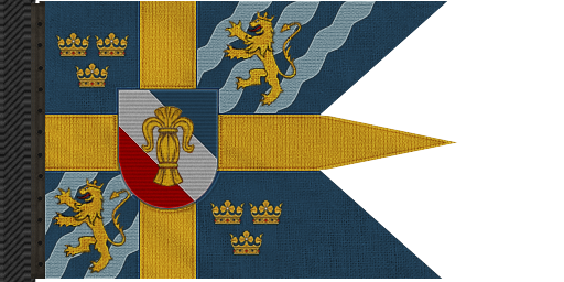 The personal standard of Kings of Sweden during the reign of House of Vasa. The standard indicates the presence of the King aboard. The three-tailed flag consists of the yellow Nordic cross on a blue background and the coat of arms of Sweden.